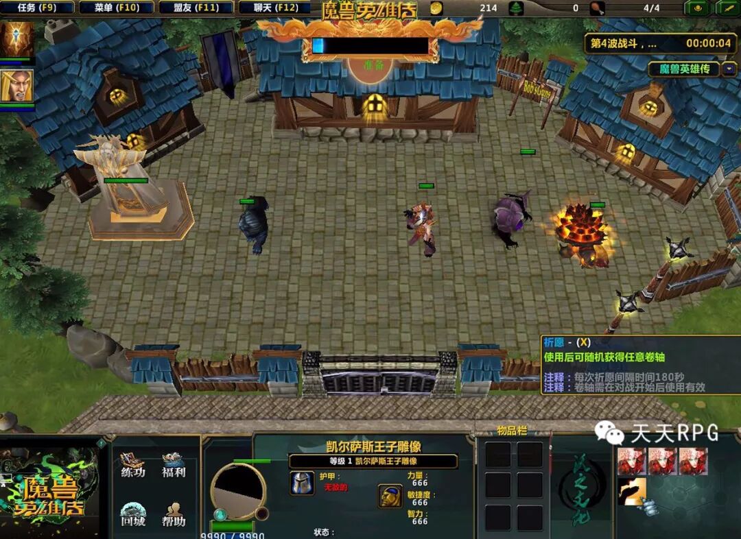 此游戏还有个比较独到的机制,那就是祈愿。祈愿除了随机给出一些道具(不管是伤害类型还是减益类型,都是敌我不分的),还可以给出人口或者金币。点左边的阿尔萨斯王子雕像来获得,免费的,CD是180秒。