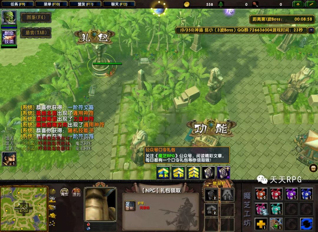 完成了开局的选择,我们来到左上角“礼包”这里,输入“天天RPG”、“魔芝RPG”、“爱上RPG”三个代码领取三种公众号礼包。