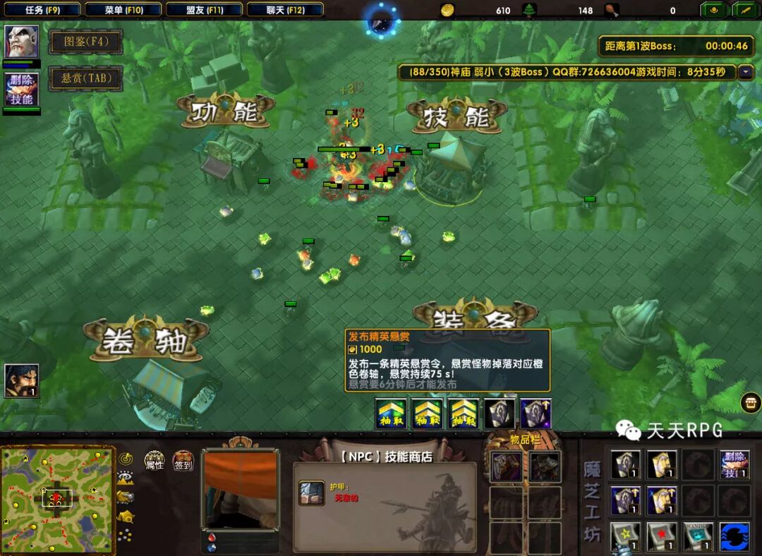 重复的技能再次使用即可提升技能等级,每个技能最高可升至5级,而技能商店的“悬赏”则可以发布悬赏召唤一只精英怪,击杀可随机获得“装备合成卷轴、专属石”等等物品。