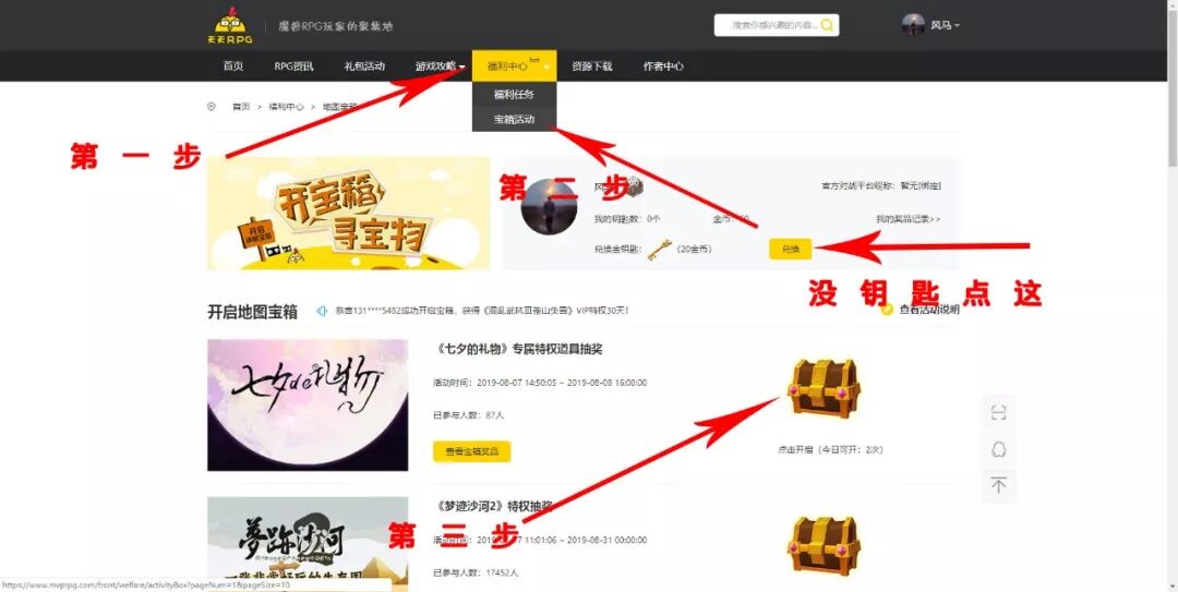 打开浏览器前往天天RPG官方网站(www.mvprpg.com),在上方的菜单栏上选择福利中心,然后在弹出的标签页中选择宝箱活动,点击七夕的礼物栏位上的宝箱,消耗一个钥匙就可以抽取。