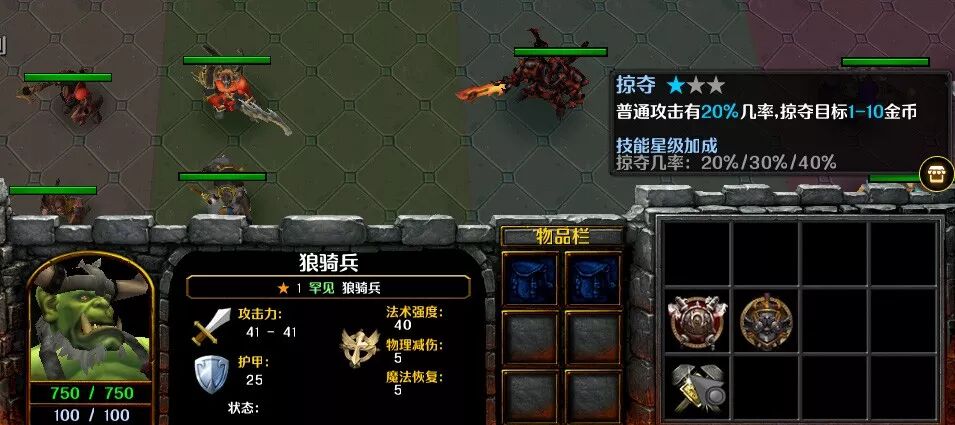 然后要特别讲一下一个英雄,我们的打金王,掠夺者。掠夺者的技能就是攻击概率偷钱,所以全力堆攻速,3星装备狂热2000金就能提供50%的攻速,墙裂推荐。