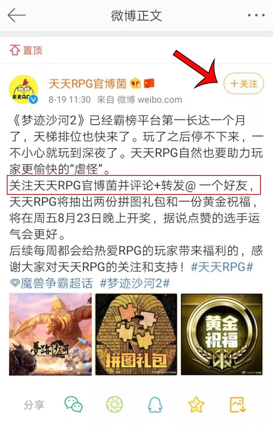找到置顶的《梦迹沙河2》抽奖微博,点击关注天天RPG官博菌,并在原微博下边评论转发@一个好友即可参与抽奖,一定要注意抽奖条件以及抽奖时间!