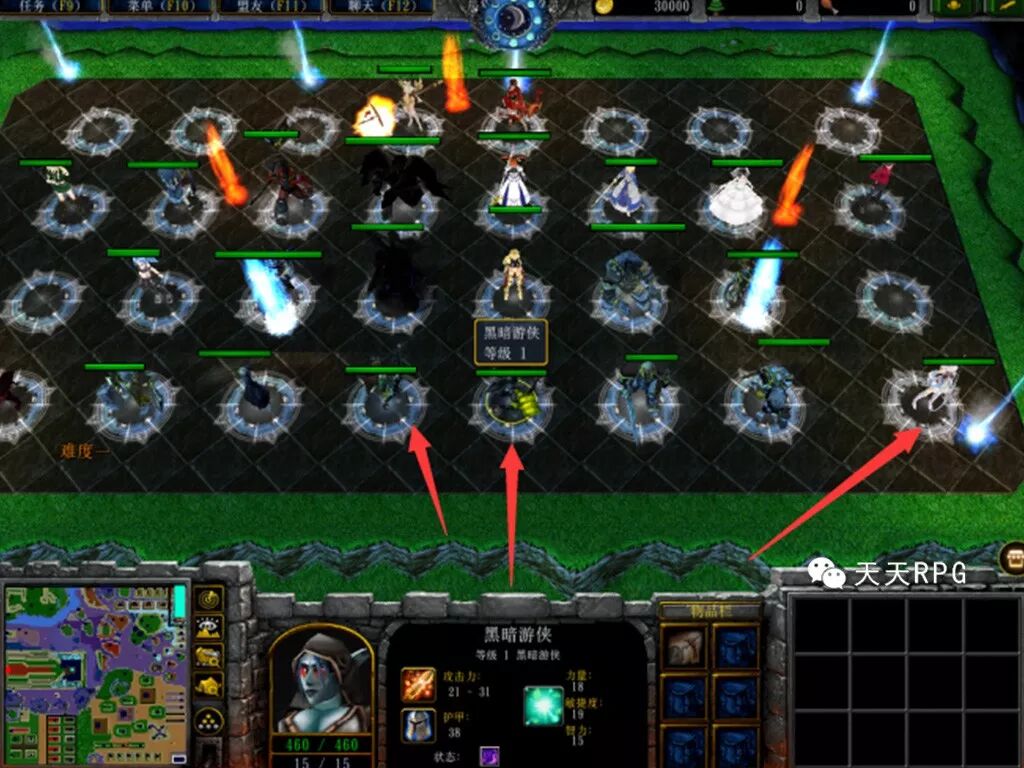 开局选择英雄,根据小鸡多次用铁头功摸索出来的结果就是建议选择远程英雄,下图箭头所指的三个英雄可以作为首选,单通建议选择最右边的“精灵游侠”。