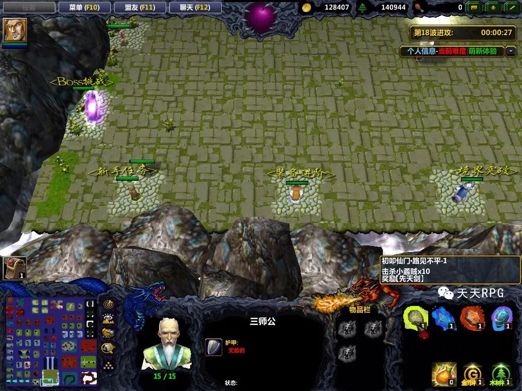 然后先来到基地左下角的三师公处,点击任务(不需要领取),传送到任务地图,击杀四个角的任务怪后,就可以获得新手几件套了。
