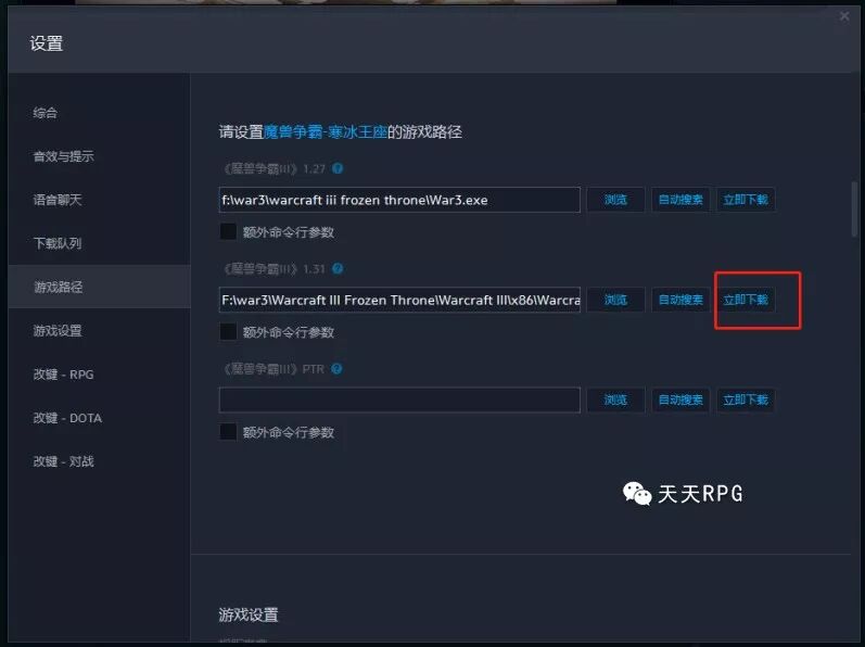 这张图需要魔兽争霸1.31版本,大家可以在魔兽争霸官方平台的设置界面直接点击下载。下载安装后平台会自动获取路径。