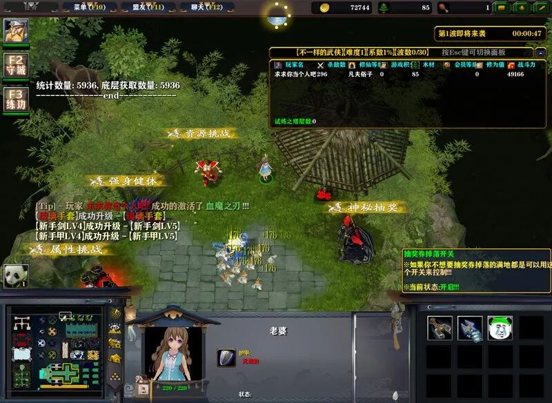 另外练功房里的老婆NPC,则可以设置我们刷怪时候掉落的抽奖券(并且可以切换背景音乐)。如果没设置的话,则会掉落在右上角。并且我们杀敌数也可以找神秘抽奖NPC(也可以用木头)来进行抽奖的。