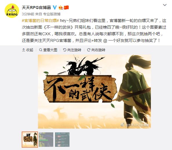 天天RPG新浪微博有《不一样的武侠》的抽奖活动,玩过之后喜欢《不一样的武侠》的小伙伴可以去微博“天天RPG官博菌”搜索查看来抽奖。