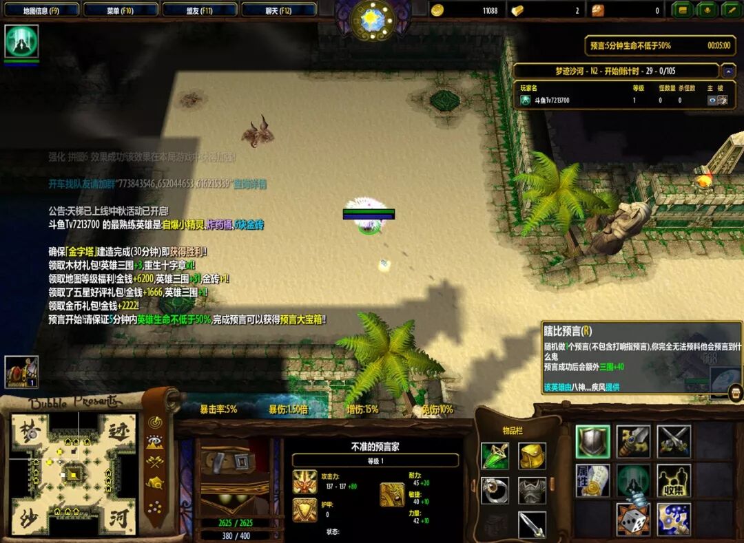 所以在金砖很紧缺的情况下这个英雄的天赋就很舒服了一局选好英雄起手先预言一发必成功!小鸡记得是5分钟或者6分钟预言一次,按6分钟算11分钟的对局时间就可以预言三个了(有一分钟是初始等待时间不出怪)