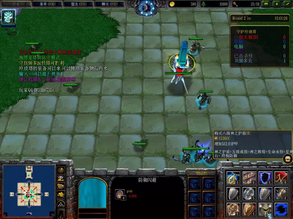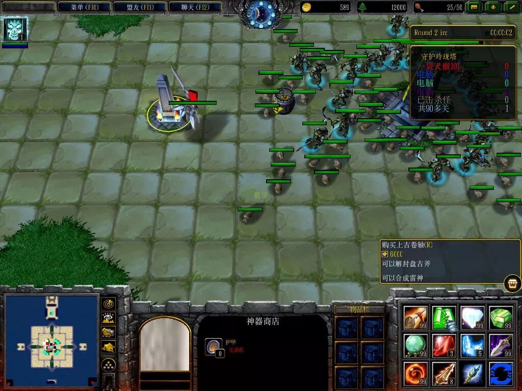 这时候,除了在基地下方的无敌药店升级玲珑塔外,还必须要给它装备高级装备了(BOSS会爆些固定的装备)。地图上四个商店,有两个就是为了玲珑塔存在的,在防御闪避商店购买神之护盾与神之辉煌,在生命回血商店购买五级戒指与生命永恒,再加上神器商店的星神石,就可以合成终极防御了。