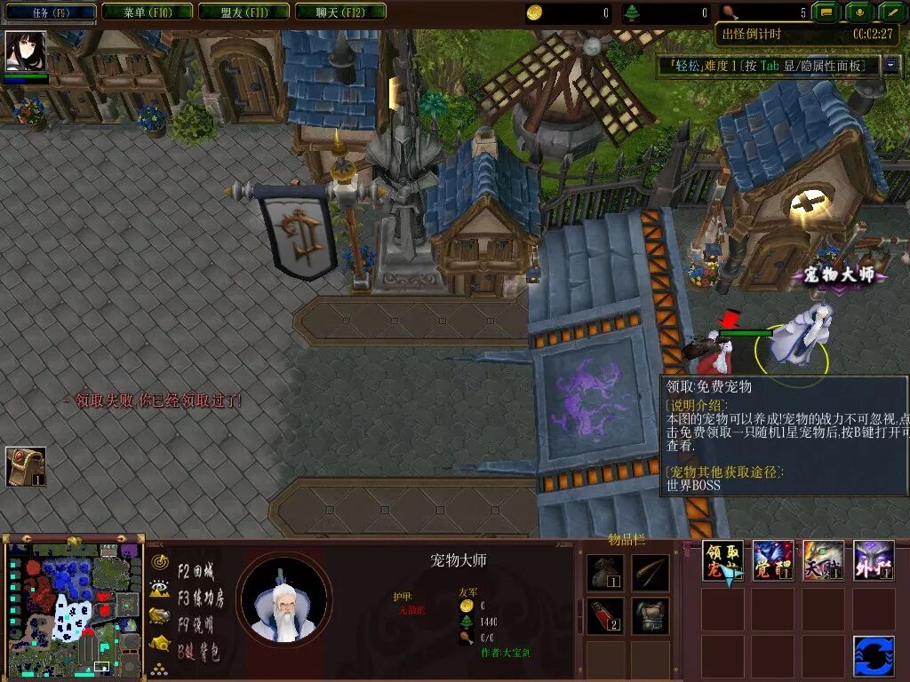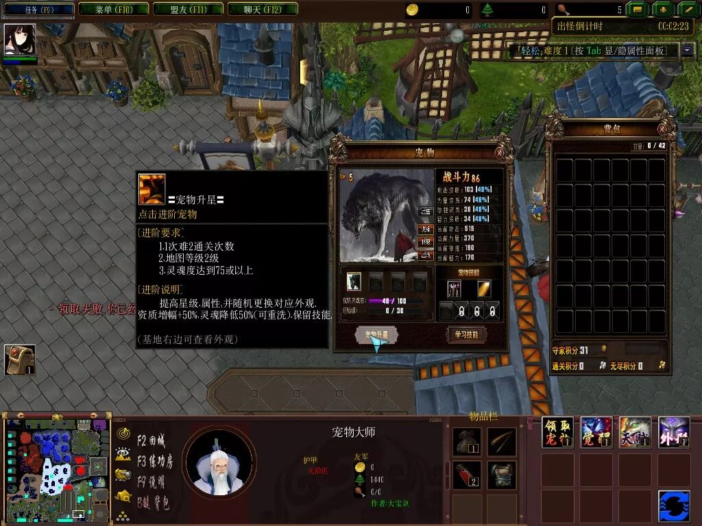买完新手两件套后,我们就回到解放前了,这时候就可以去领取下其他免费的资源了。基地右边的宠物大师处可以领取一只随机1星宠物,一只战狼。按B键就可以弹出宠物的属性、介绍及背包了。