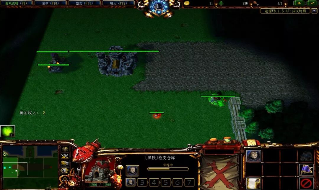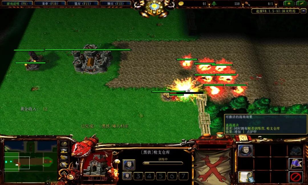 开局之后,建造你的初级建筑,建筑随便造在哪里都可以,造完之后会自动出兵,也不能控制。
