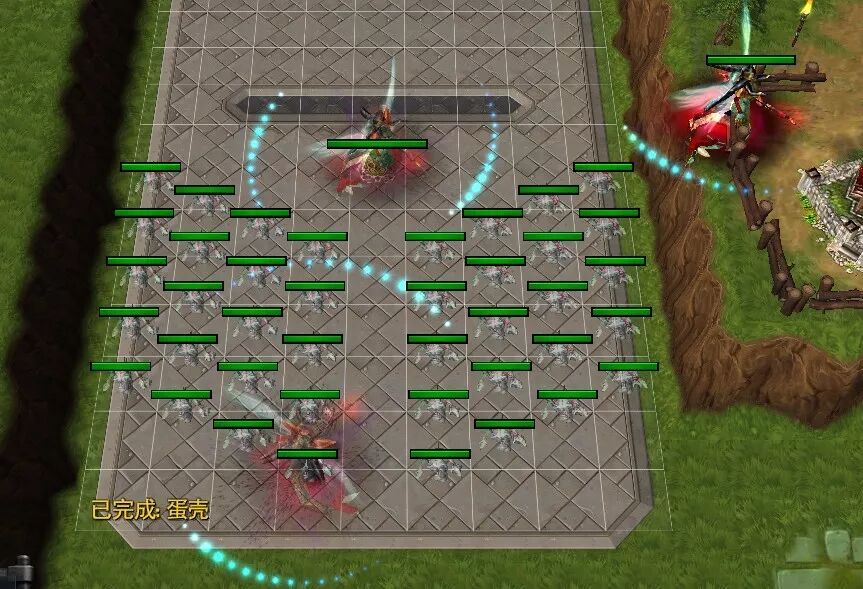 我们可以看见,出怪后,第七排的鱼并没有脱节,但是第七排左右2边的鱼脱了,这就是一个概念的半圆,在这个半圆内,单位不会脱节,超过这个半圆,那么就会脱节了。如果用半圆造位的话: