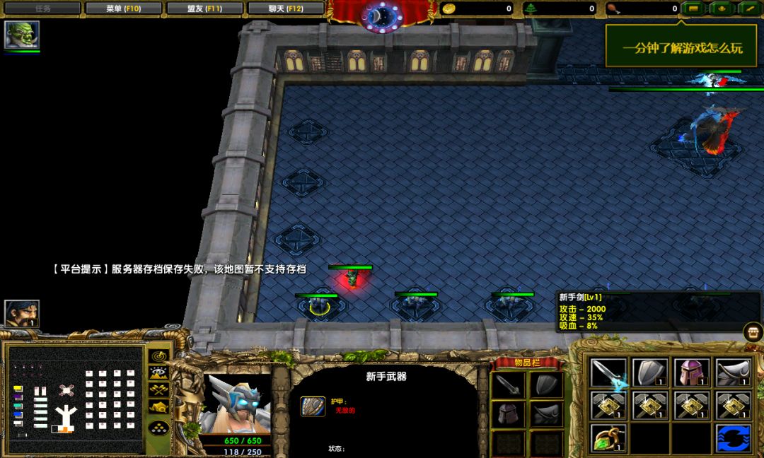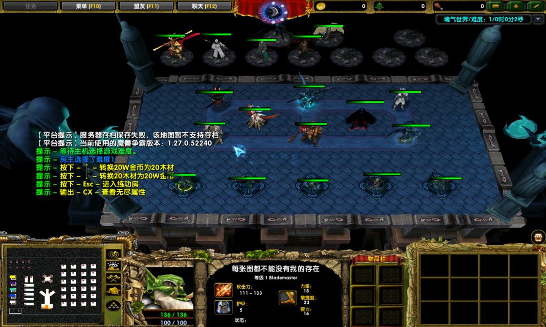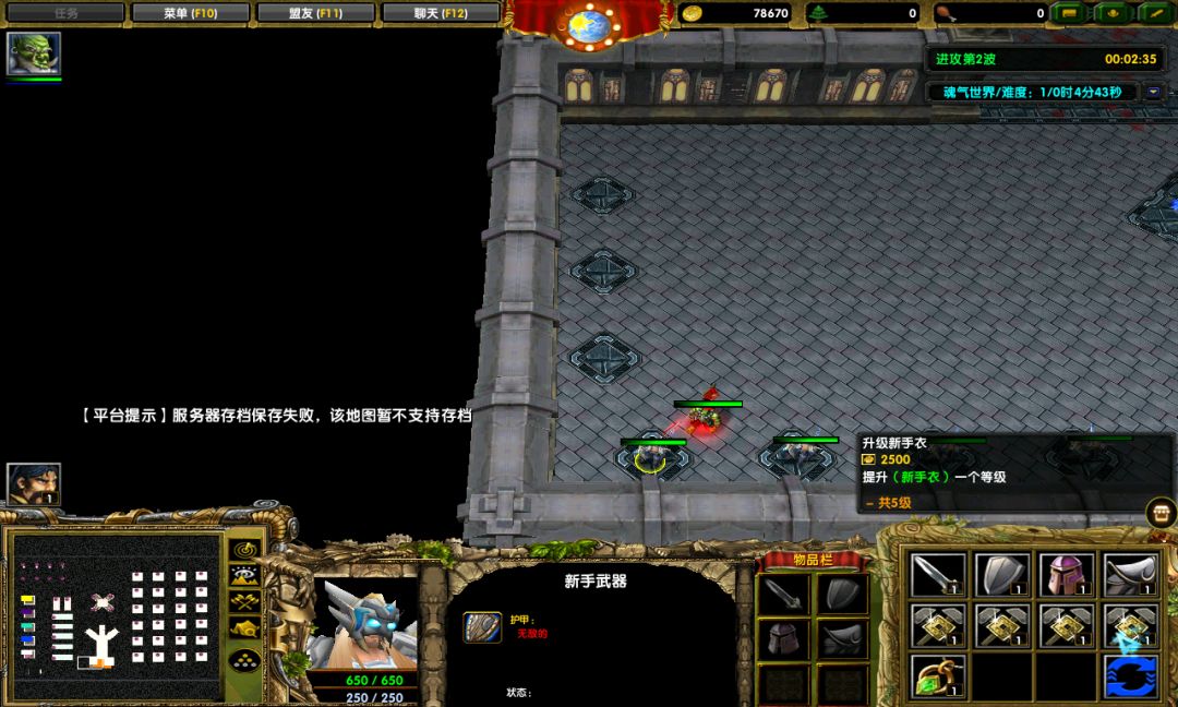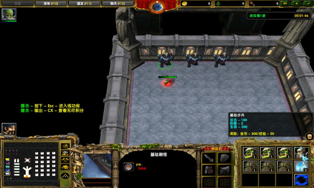 现在我们身上是穷的一毛钱都没有,所以,要去练功房开刷了,但是这里的练功房的快捷键是Esc,回城键是D,和其他的防守地图不太一样。