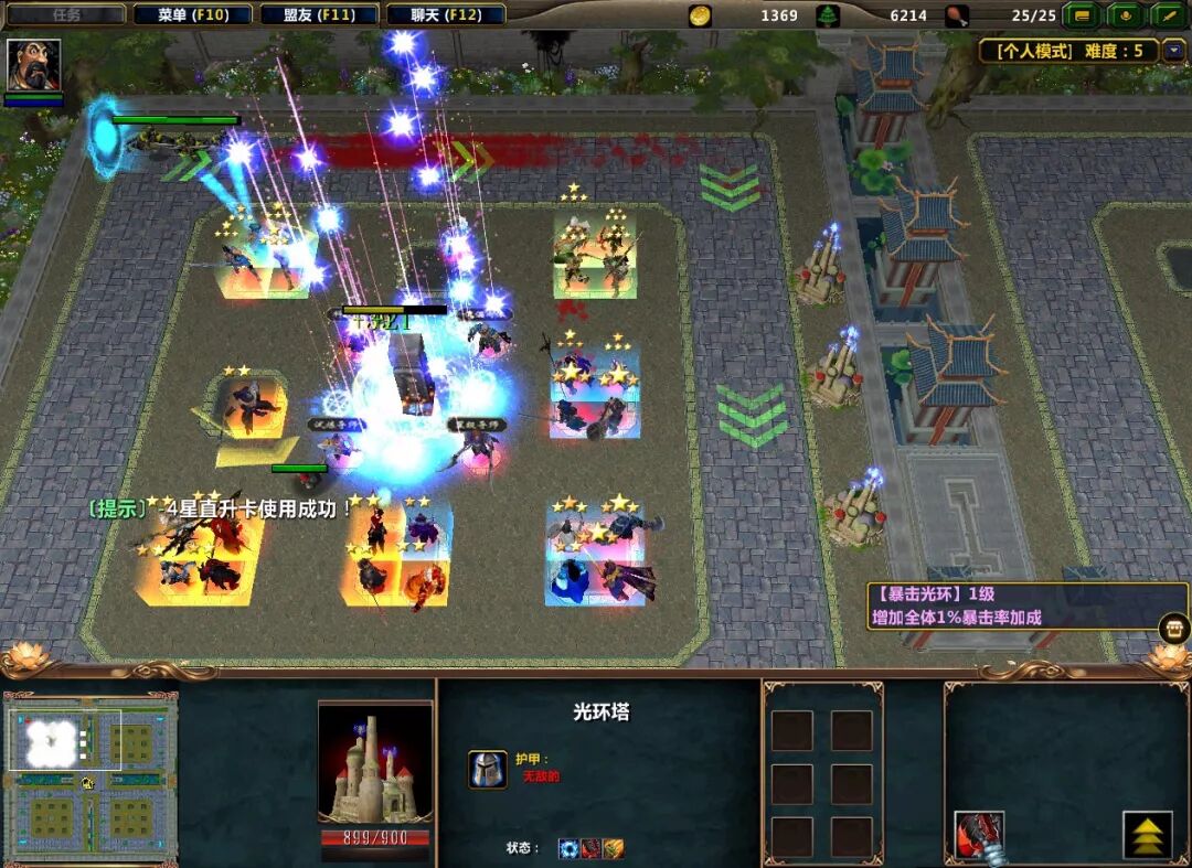 凑齐羁绊组合后我们将三个光环塔全部提升至满级,光环中如果出现“减甲、加攻、攻速”这种光环是最不错的。