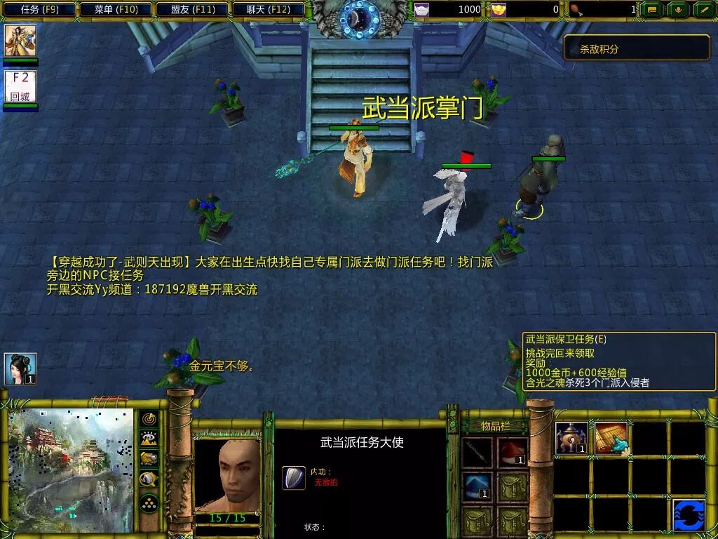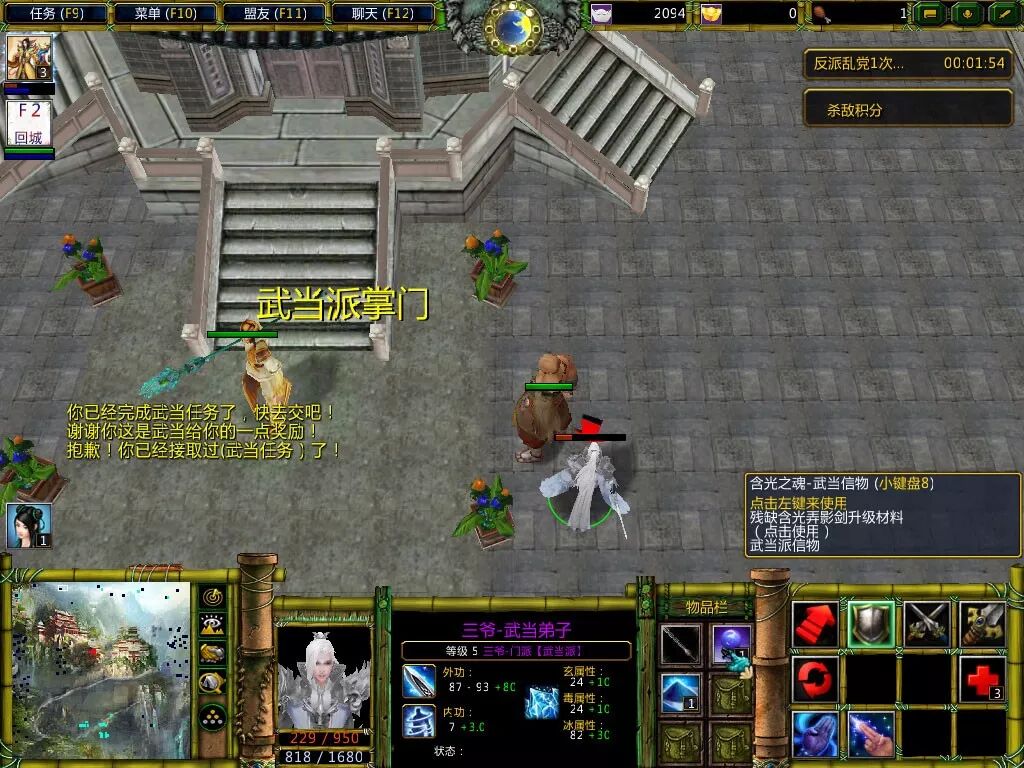 小鸡选择的是武当派,门中有掌门与武当派任务大使两位NPC,我们需要先在任务大使处领取武当派保卫任务。