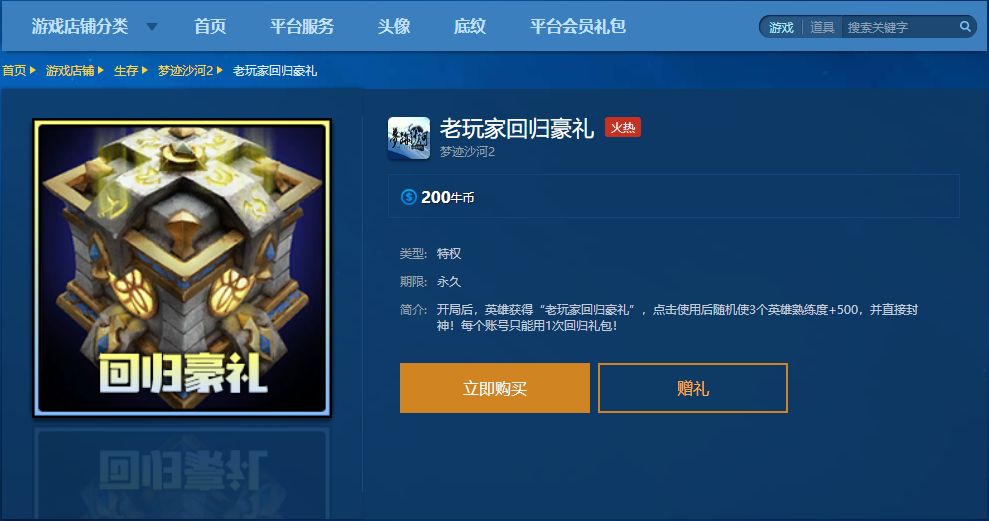 首先就是商城中新增了一个老玩家回归豪礼,购买了此礼包的玩家可以在进入游戏后在物品栏中点击使用此礼包,可以随机使玩家三个未封神的英雄直接封神!有需要的玩家可以购买一波,注意每个账号只能使用一次回归礼包。
