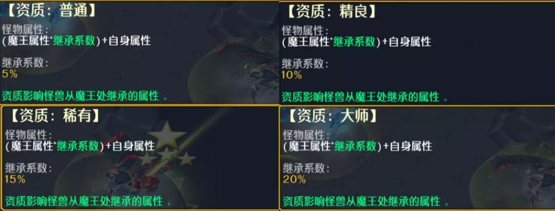资质一共有普通、精良、稀有、大师、传说、宗师六种,资质影响怪物从魔王处继承的属性。六种资质的继承系数分别为5%、10%、15%、20%、30%和40%。小鸡表示还没见过宗师,非酋落泪。