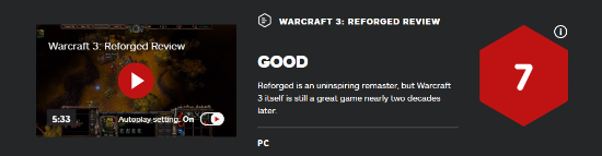 而在早些时候,全球权威游戏评测媒体IGN为《魔兽争霸III:重制版》给出了7分GOOD的评价。按照IGN的标准,一款评价为7分GOOD的游戏,是一款不错的游戏,但是在技术层面还存在很多的问题,会对游戏的体验造成影响。