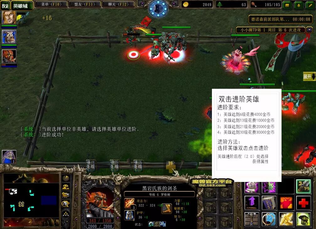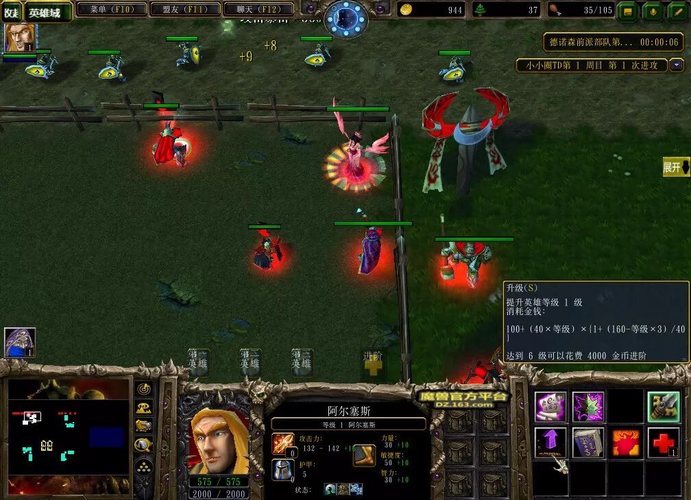 选择好英雄后,我们需要将他建造在己方区域里,也就是那圈栅栏里。我们的英雄无法依靠杀怪升级,需要我们花费金币手动升级,每次升级的金币与英雄的等级挂钩。