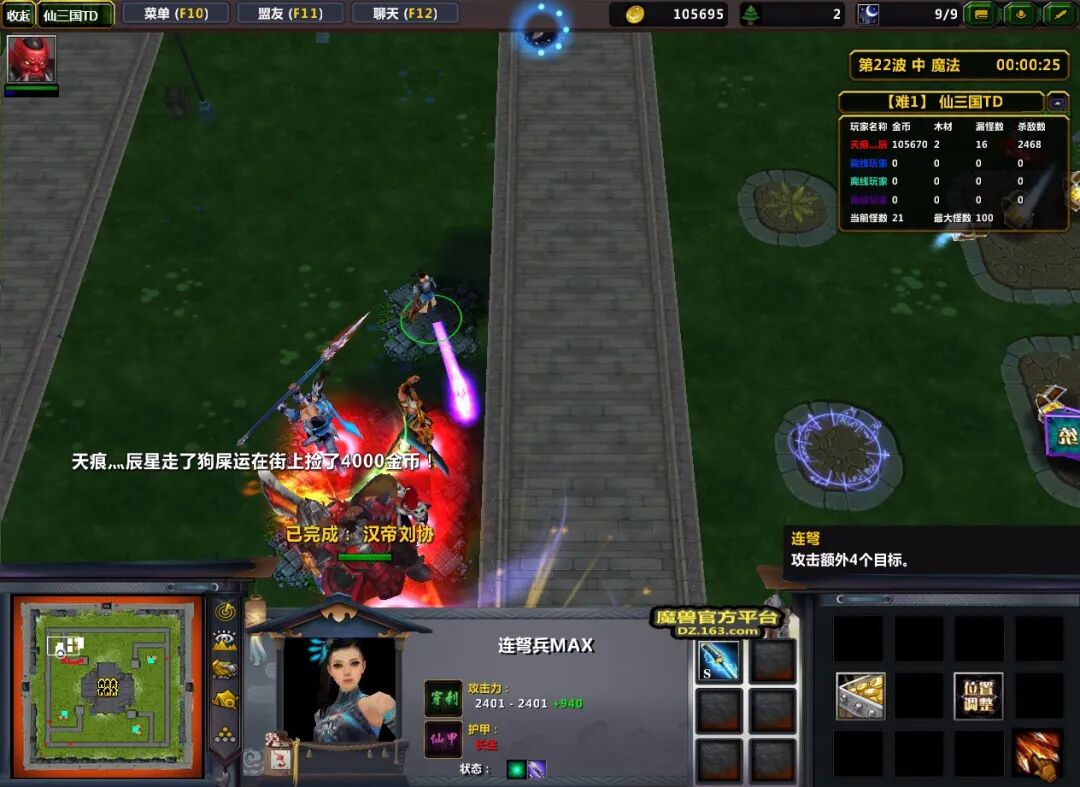 这里需要提一点“连弩兵”这一防御塔,当你前期英雄守不住进攻怪时,可以建造一个低级防御塔来进行防守。