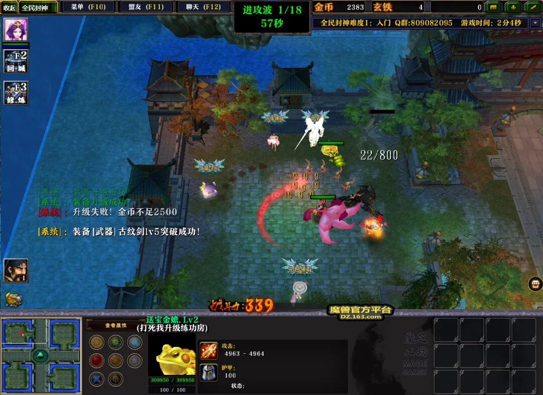 练功房内的怪物提升需要击杀“送宝蟾蜍”,通过强制攻击(A键)对他主动攻击后,在限定时间内成功击杀则可提升练功房等级。