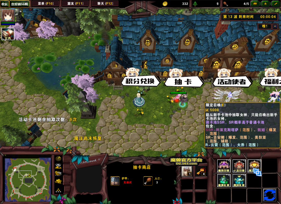 除了两个女武神,接下来的女神就要在地图中间的抽卡NPC这里抽取了。抽卡NPC这里有稀有召唤、十连抽和绑定召唤三种功能,新手期建议大家就抽取绑定召唤吧,抽到SSR女神的概率可不低。