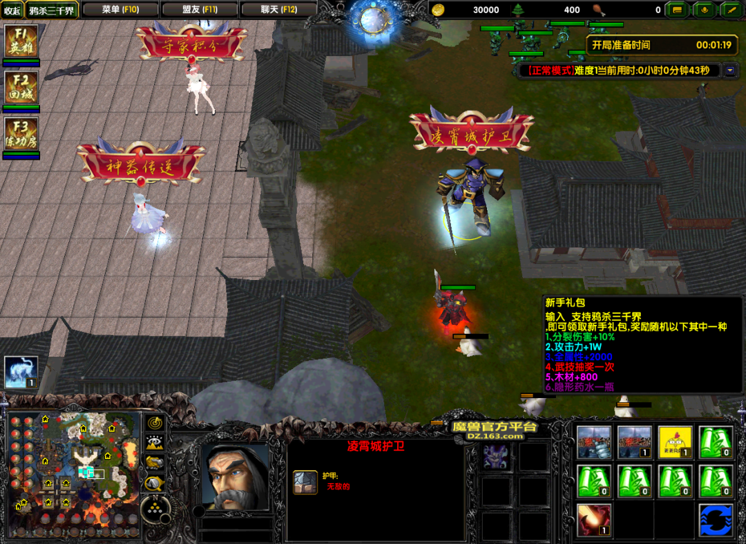 游戏开始后,我们可以先到右侧的凌霄城护卫处领取三个礼包,对应的礼包口令分别是“支持鸦杀三千界”、“1001916026”与“TTYSSQJ666”,记得先输入后领取。