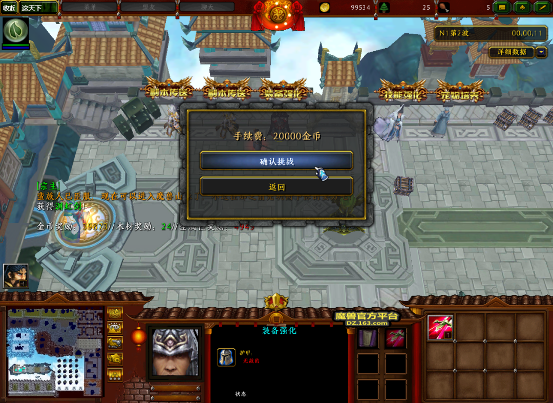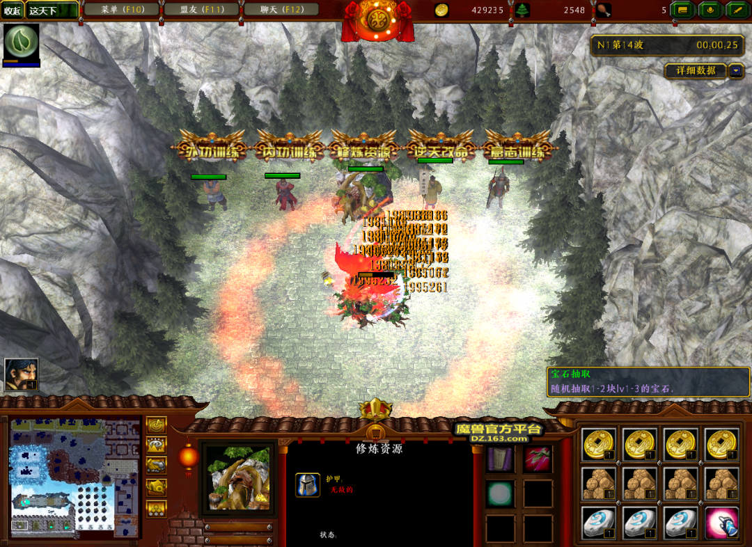 这个时候我们可以到练功房中抽取一下宝石,最好的当然是抽到主属性的3级宝石了。打到的金币和木头用来提升我们的外功和内功等级,外功按顺序提升即可,而内功可以只提升特殊属性与主属性,省下的木头可以让我们尽快发育。