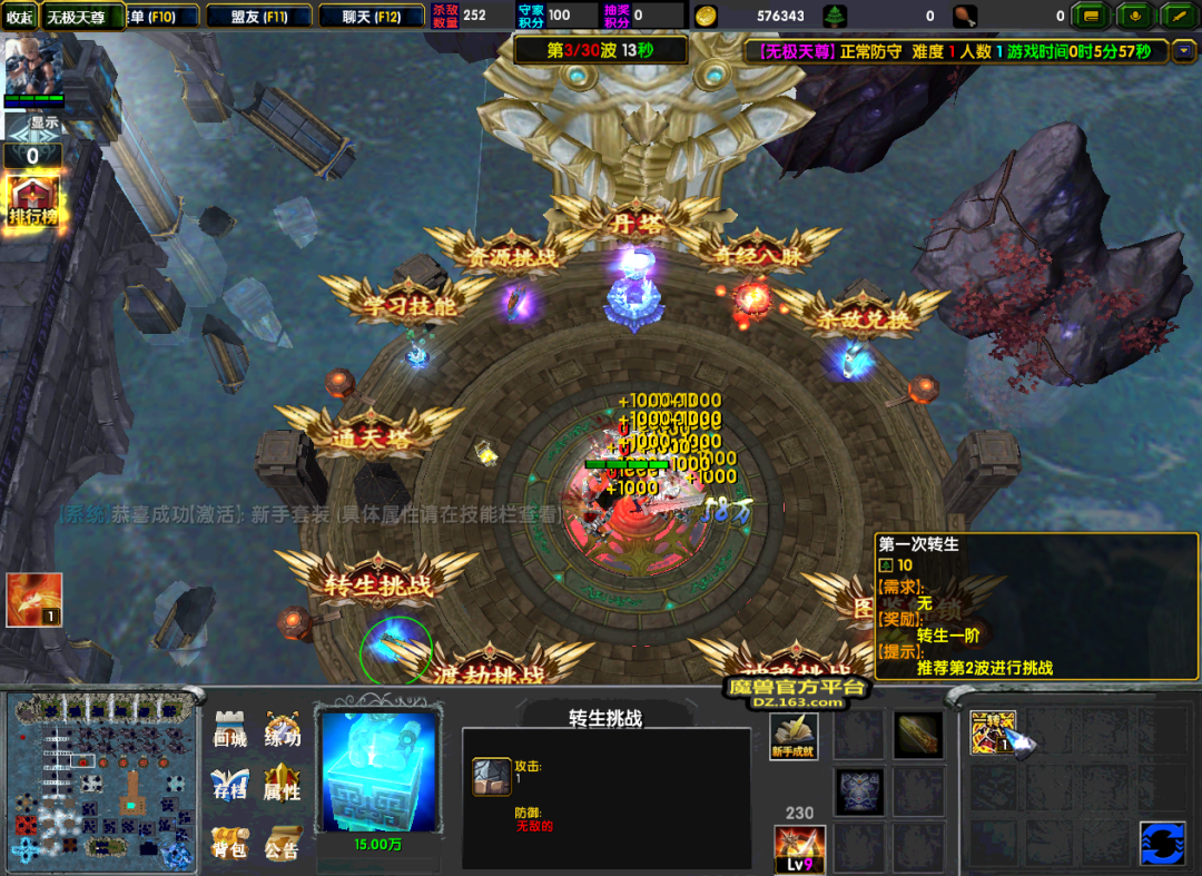 激活了新手套装后,我们就可以进行转生挑战、渡劫挑战以及道体挑战了。这几个挑战的难度相当,可以按顺序一个个挑战过去。