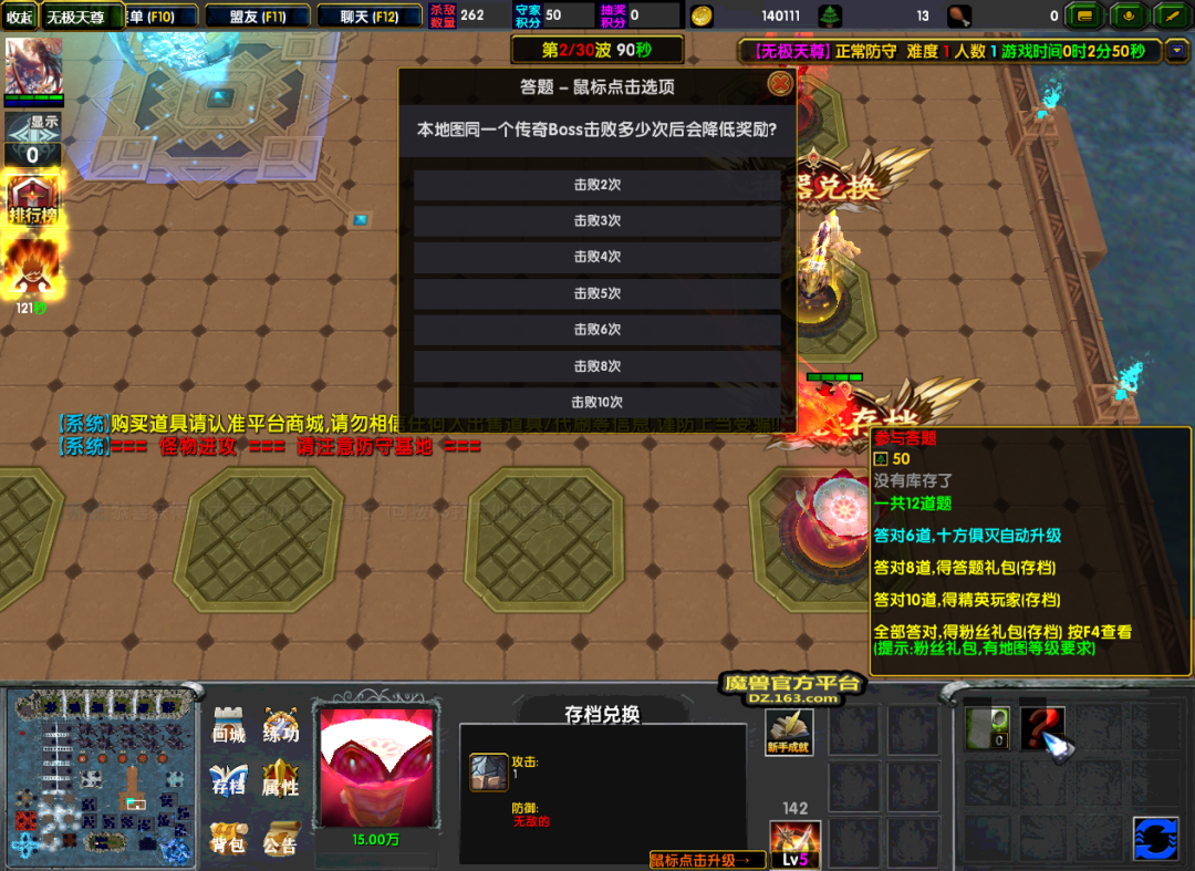 仙术奖励比较看人品,那么我们可以到基地右下角的存档兑换这里展示自己的实力了。游戏过程中我们可以参与答题,系统会给我们出12道题,答对的题数对应着不同的奖励。