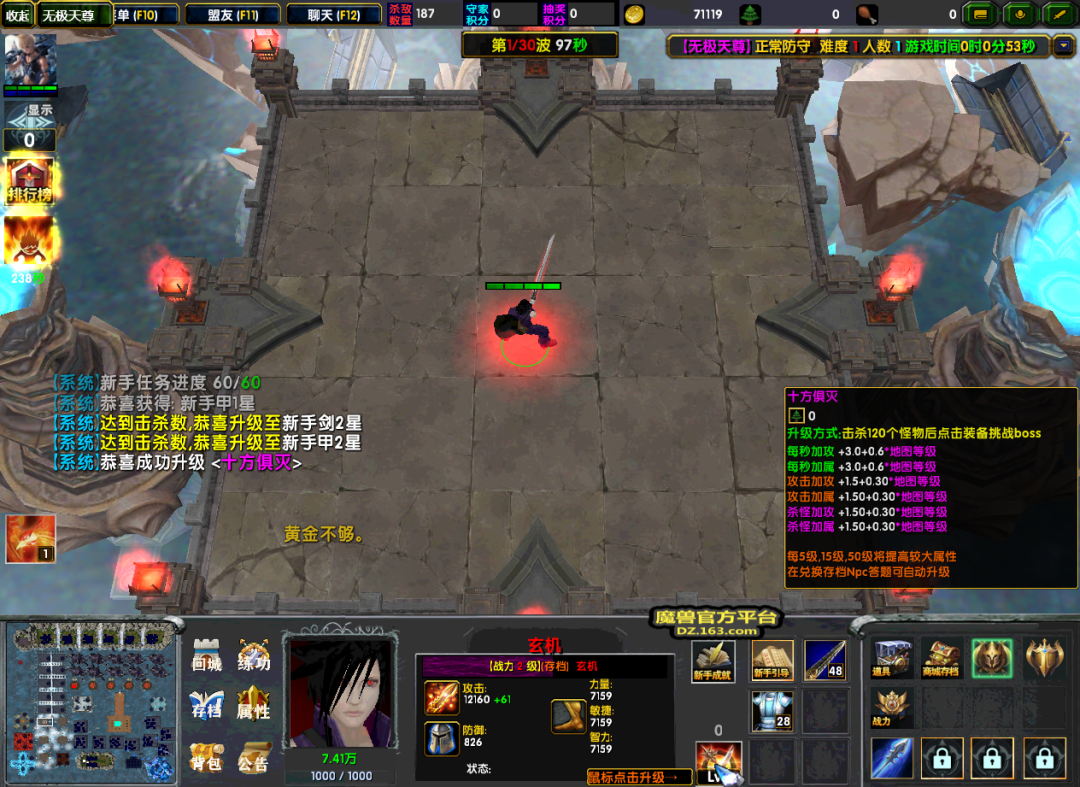 新手任务奖励的十方俱灭与新手装备都是可成长的道具。其中十方俱灭在吸收了一定的杀敌数后就可以点击挑战了。而新手武器和衣服在吸收满杀敌数后就需要花费木头进行挑战升级了。
