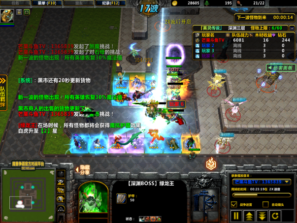 在17波的第二个深渊BOSS到来之前,我们的主播又凑齐了五虎羁绊,这战力相当竟然。第二个深渊BOSS是绿龙王,技能效果是所有怪物都会获得魔抗护盾效果,也就是增加了怪物的魔法抗性,是法师阵容的强敌。