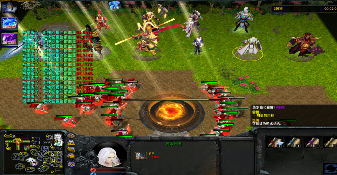 这就很有意思了。因为小鸡自己也是许久未见到少了放技能就打不过小怪的图了。除此之外,回血的方法则是通过英雄身上的药水技能,别小看了这个技能,这可是救命神技。初始回血500点,还能通过基地旁的药水升级商人购买升级卷。