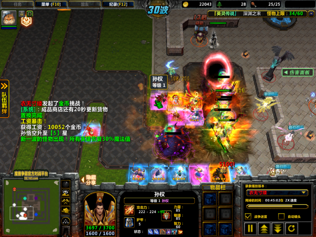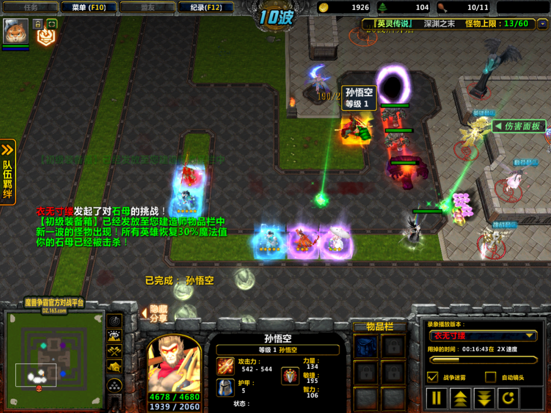 第十波的时候,玩家掏出了一只孙悟空,这个选择让小鸡比较意外的。不过最近几次更新,孙悟空加强了不少,很多玩家对其与吕布孰强孰弱起了争执,那就让我们来看看这局中孙悟空的表现吧。