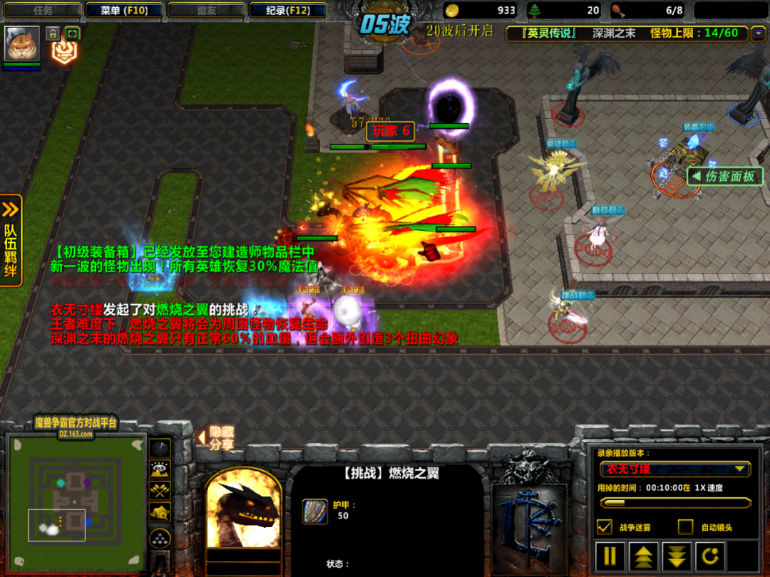 由于发育相当的,所以在第五波开始没多久就开启了燃烧之翼的挑战。在深渊之末难度中,燃烧之翼的血量只有正常的60%,但是会额外创造3个扭曲幻象。