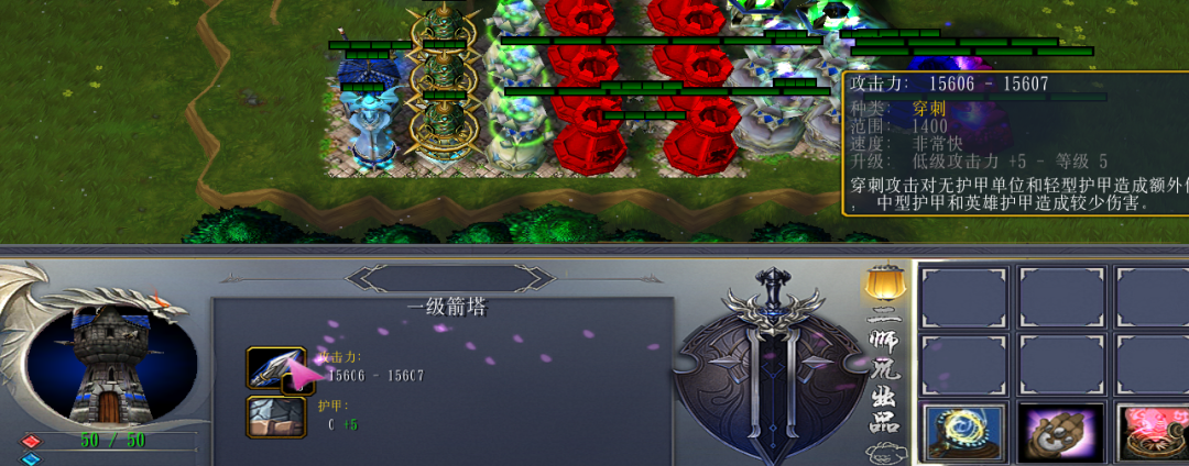 可以从上图直观地看到,在科技拉上来后,即使是最基础的一级箭塔,也能拥有上万的攻击和1400的攻击距离。