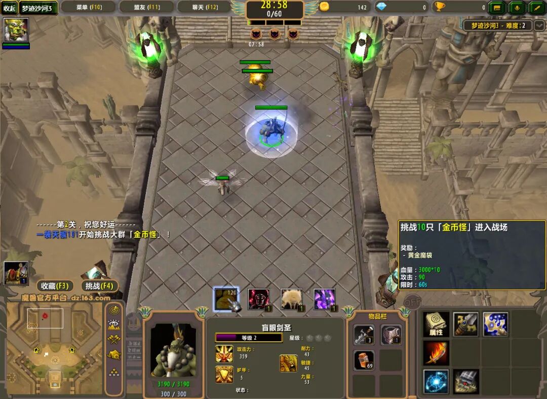 挑战开始后,我们会随机获得一个英雄,小鸡比较喜欢盲眼剑圣与金币钱袋。前者的技能效果比较给力,后期也能打出高额的AOE效果,而后者是欧皇的最爱,小鸡有两次出门第一个掉落的就是1W的金币,直接在挑战怪CD前将两件装备都升级到了蓝装,堪称最佳开局。