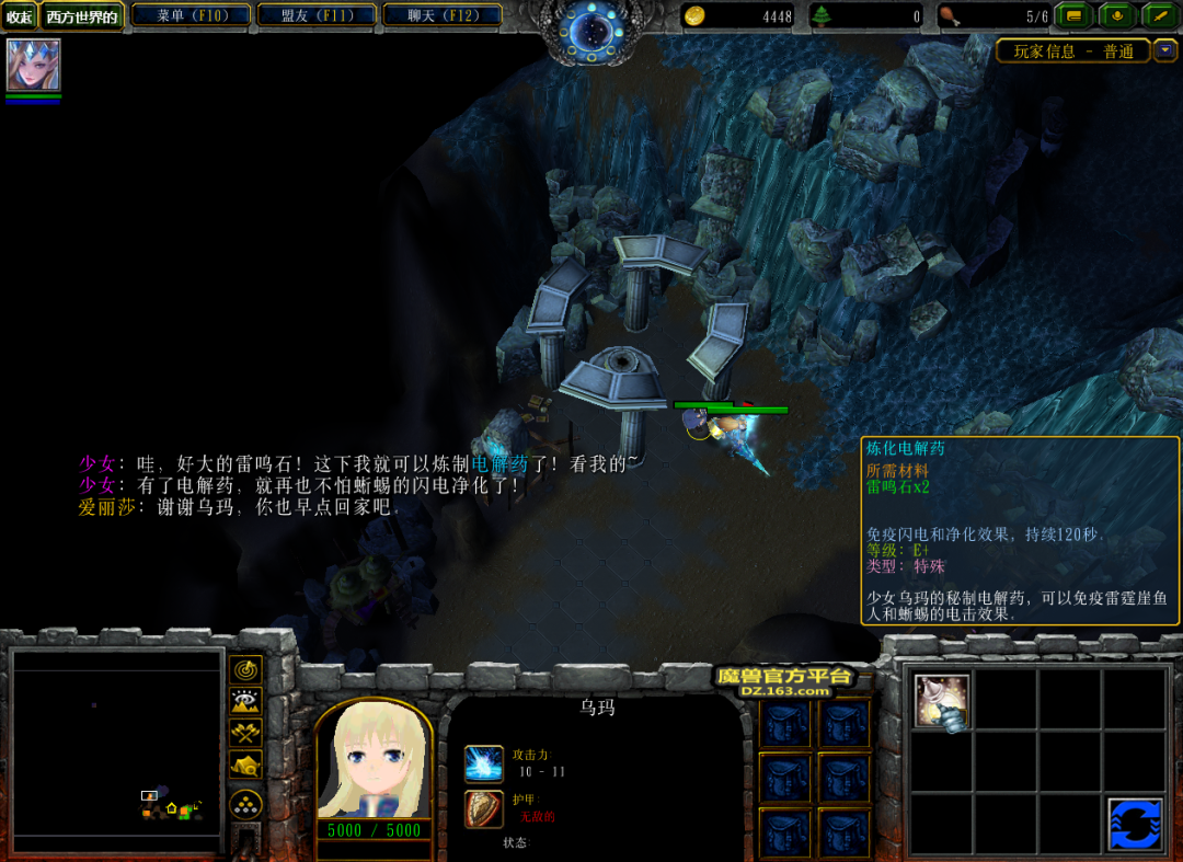 在前去需要古代洛比篷人的路上,我们会在雷霆崖路口遇到少女乌玛。她请求我们帮她收集五块雷鸣石,这样她就可以制作出电解药,帮助我们抵抗雷霆鱼人与蜥蜴的电击效果了。