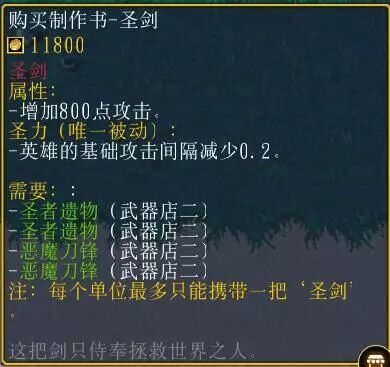 作为DOTA里装备链的顶端,圣剑的牌面自不必说。效果,肯定是最强的,但是价格也肯定是最贵的。增加800攻,基础攻击间隔减少0.2,圣剑配合高攻速范围溅射的英雄可谓是珠联璧合。虽然效果强劲,卷轴11800+武器12200,总价格2W4。不要为了憋一把圣剑把局势搞崩了~
